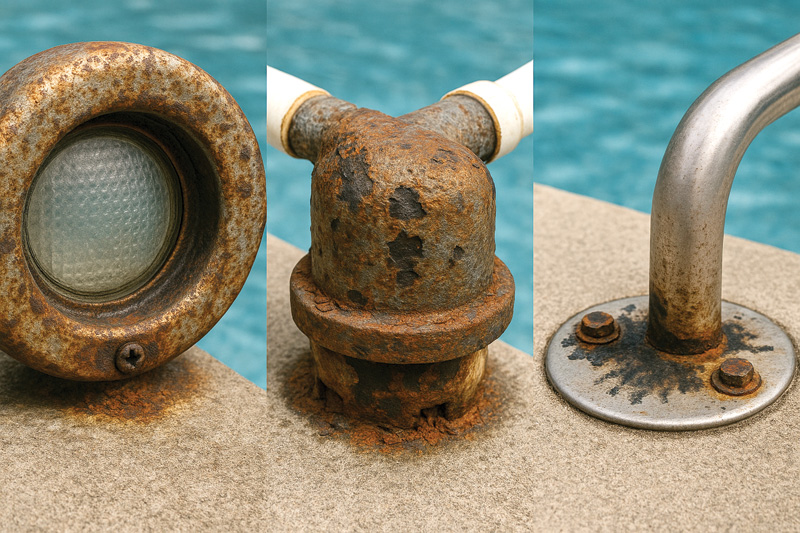 Most pools have lights, and the light ring is typically made of brass or copper. If the system includes a heater, the heat exchanger is often made of copper or another type of metal. This creates a highly concentrated solution of sodium chloride in contact with three different metals, and when combined with an electrical current, the potential for corrosion increases significantly. This is the perfect storm for galvanic corrosion. In this case, copper will corrode, and fixtures will appear black and discoloured. In fact, the key determinant of galvanic corrosion is the discolouration of metal parts.