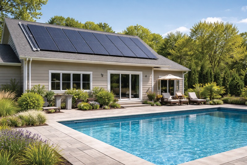Hybrid pool heaters can also combine solar pool heating with heat pumps. The integration of solar maximizes efficiency in the summer, and the heat pump comes into play in the winter months—making this combination a year-round solution.
