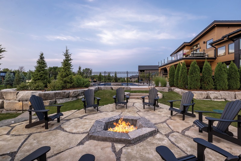 The scope of work went well beyond just the pool. About 279 m2 (3,000 sf) of patio area, large armour stone features, a substantial water element, and a dedicated firepit zone were included in the design. Pathways, lighting, fencing, and planting added finishing touches, creating visual and functional unity among the different outdoor areas.