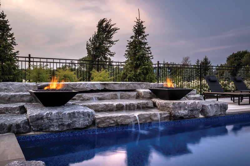 At the centre of the project is a 6 x 12 m (20 x 40 ft) rectangular pool. It features two fibreglass step units positioned at opposite ends, providing multiple entry points and enhancing circulation within the space. A custom waterfall with integrated fire bowls serves as a focal point, but adds extra mechanical and coordination considerations.