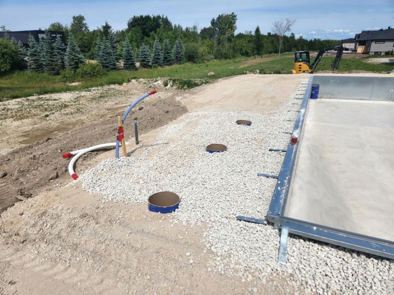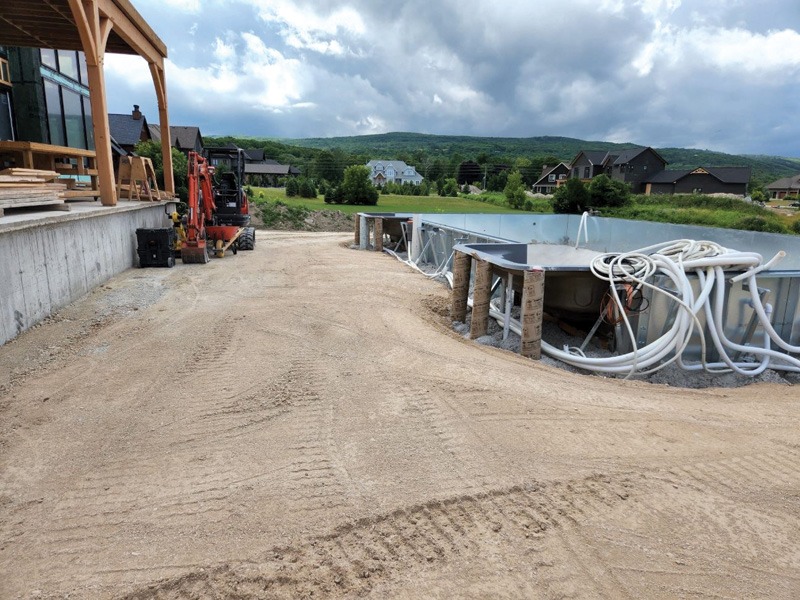 Pool wall panels were installed and secured, followed by base preparation for patios and armour stone installations.