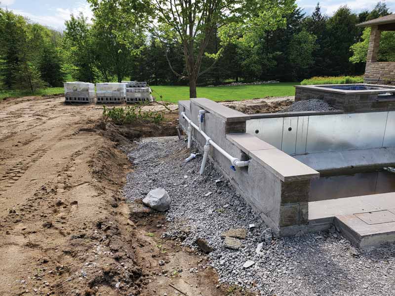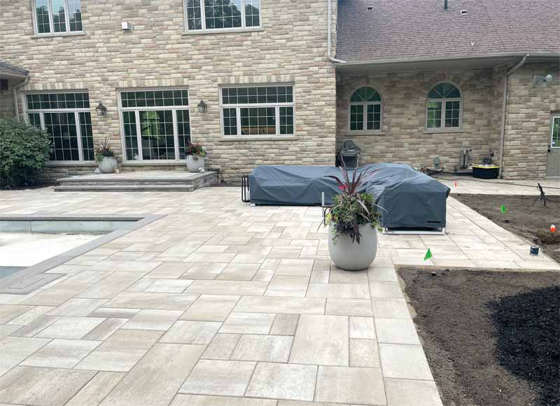 Landscaping material was chosen to complement the exterior stone of the home and blend in with the palette the surrounding nature provided. The colours used are slate grey, with the pavers being beige, and the ledge rock being brown.