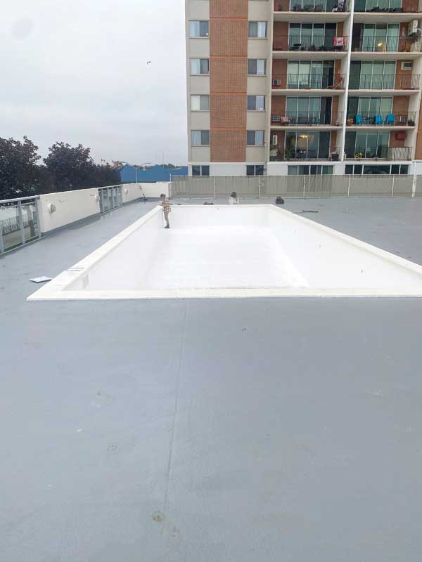 Once the surface was prepared, workers rolled out 1.8 m (6 ft) wide strips of the PVC membrane and heat-weld them together on-site for a smooth finish.